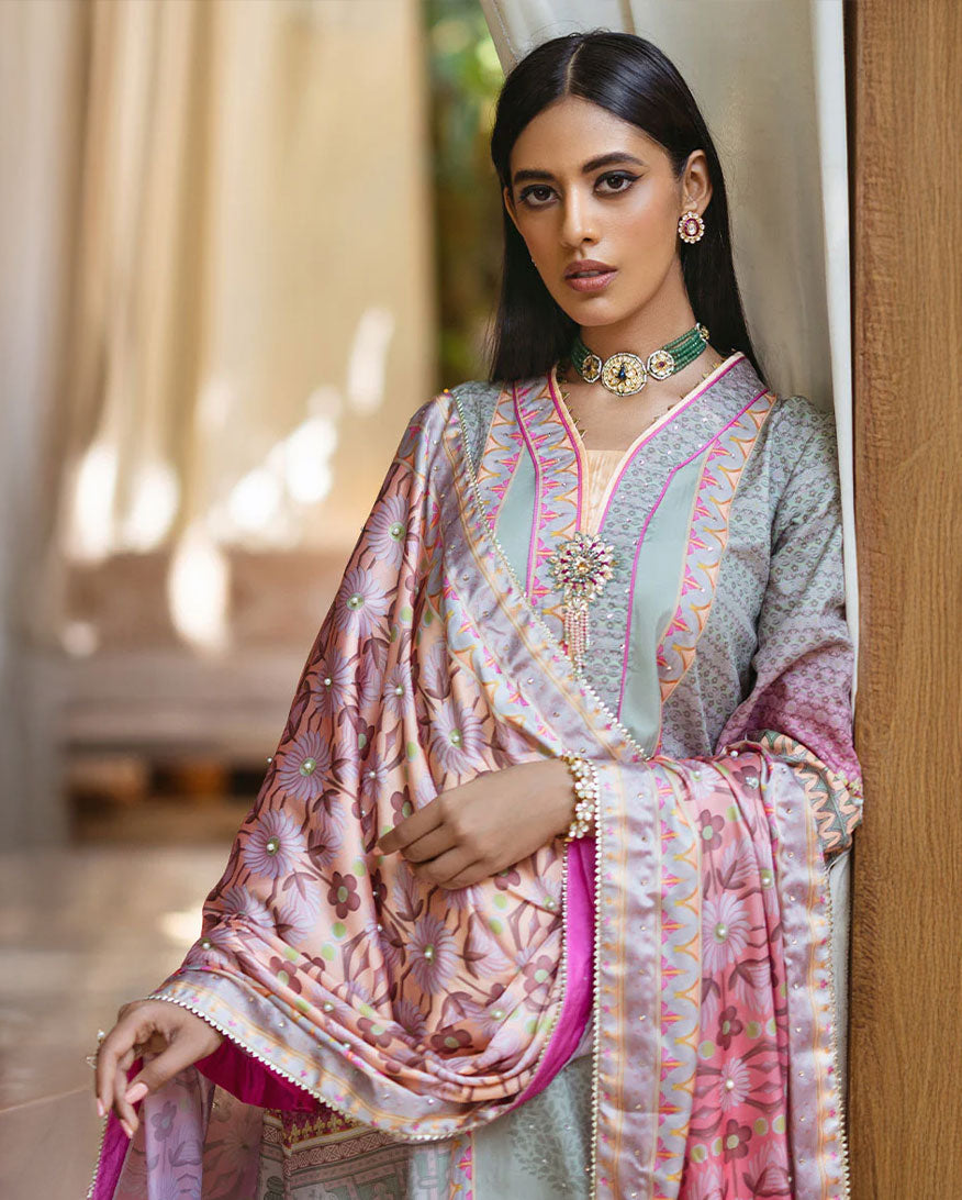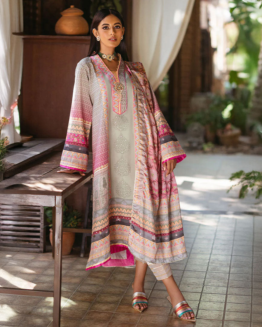 Taffy is a whimsical blend of grey and pink, crafted from luxurious printed raw silk. This outfit features playful embellishments that bring a fresh vibrancy, while the flowing silk dupatta drapes effortlessly, enhancing your silhouette. With Taffy, embrace a chic yet playful aesthetic.