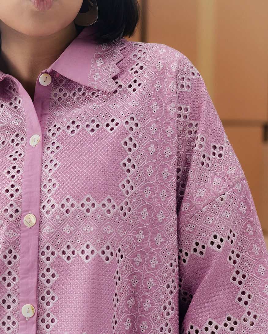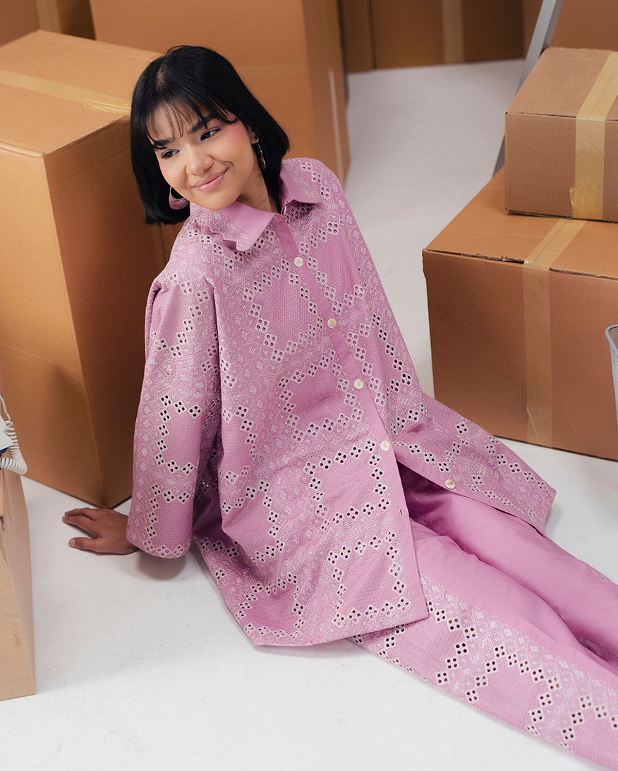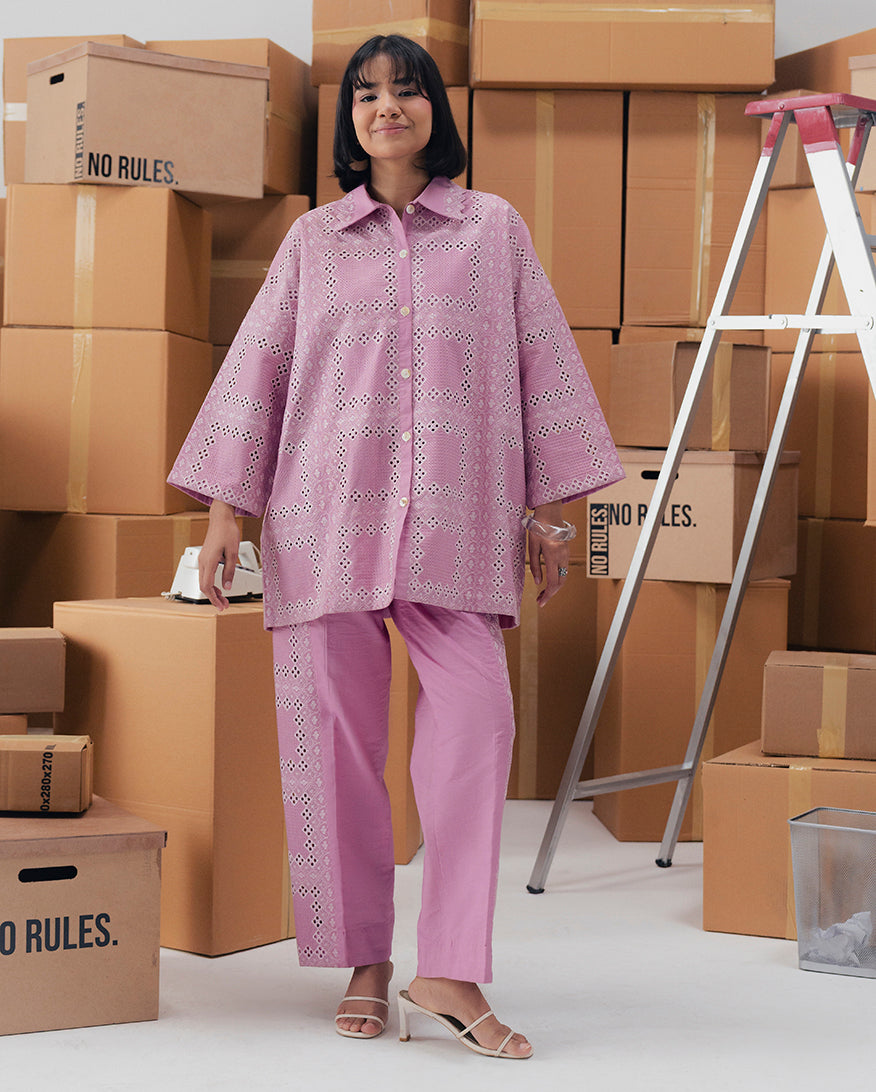 Own the moment with Untamed Aura a cotton embroidered shirt paired with dyed cotton trousers in playful pink. Perfect for women who dare to stand out.