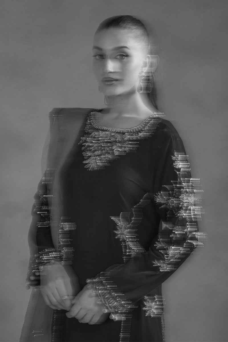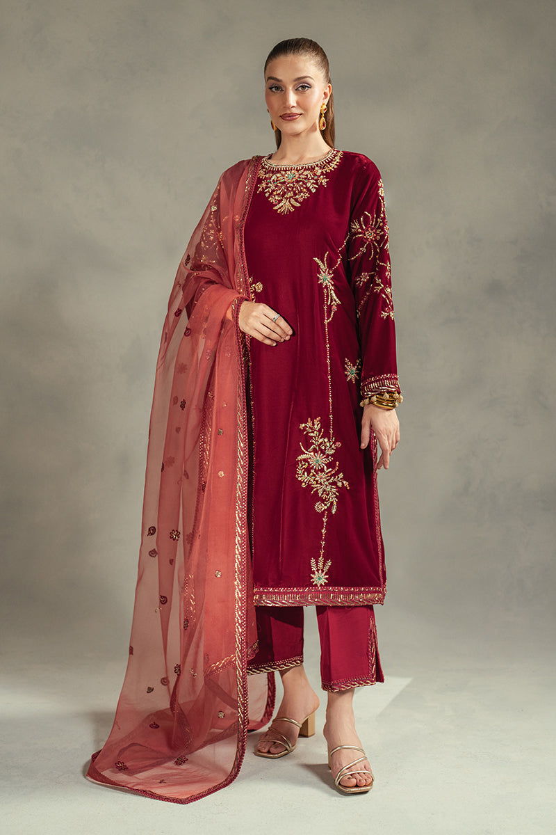 This luxurious outfit features a velvet shirt paired with raw silk bottoms and an organza dupatta. Adorned with pearls, bethki, crystals, resham, naqshi, dabka, kora, and sequins, it offers stunning embellishments. The multi-head embroidery adds an intricate and vibrant finishing touch.
