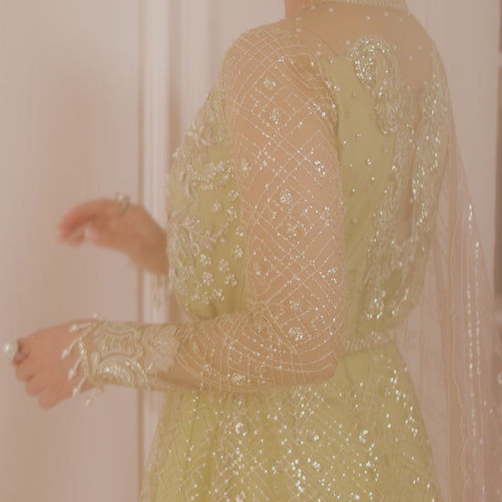 - Embroidered, sequinned & hand embellished front yoke (net)
