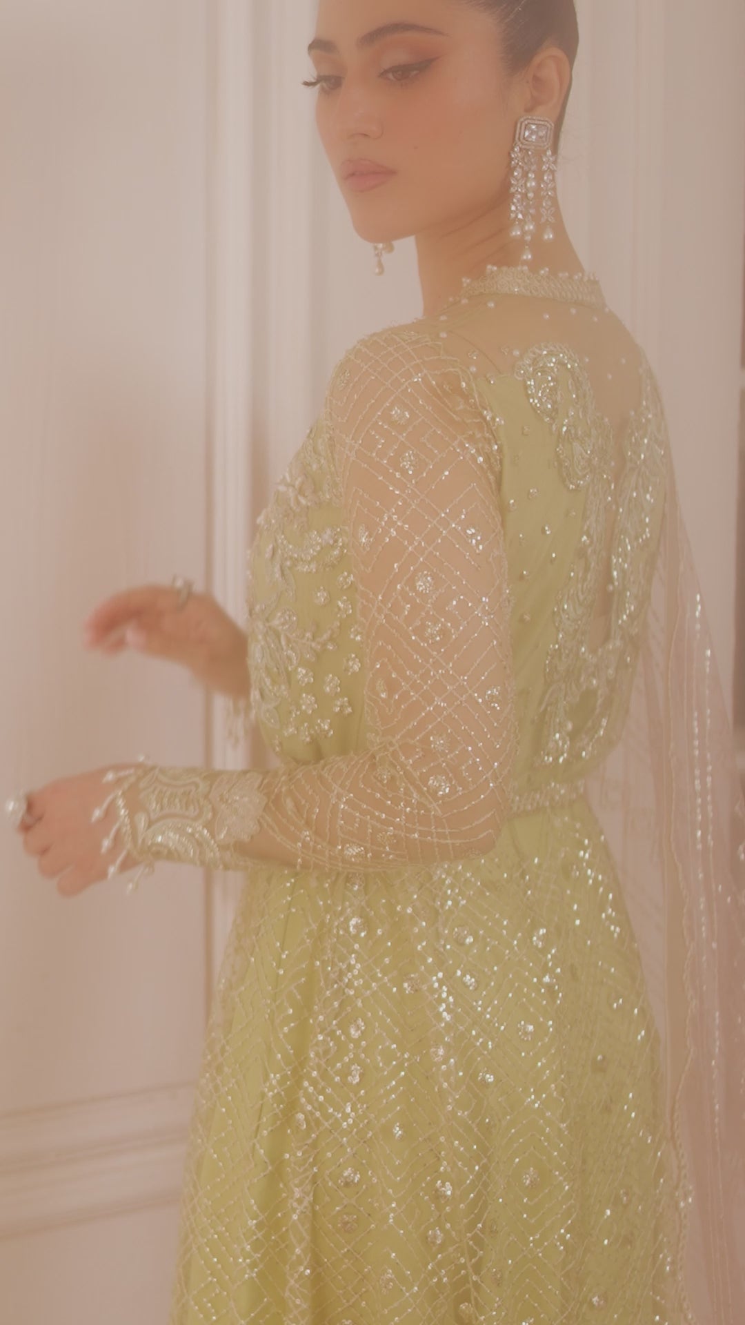 Delight in the freshness of Wasabi, a mint green masterpiece paired with a soft powder pink dupatta. Intricate embroidery and delicate embellishments bring this vibrant yet elegant ensemble to life.
