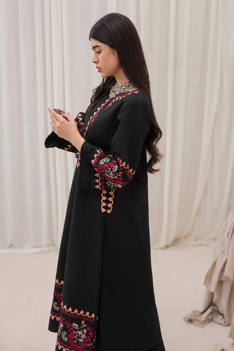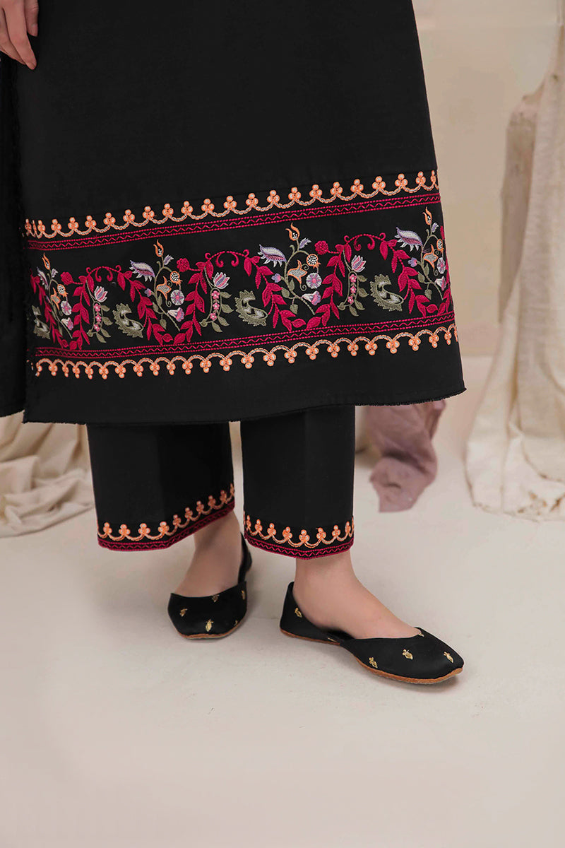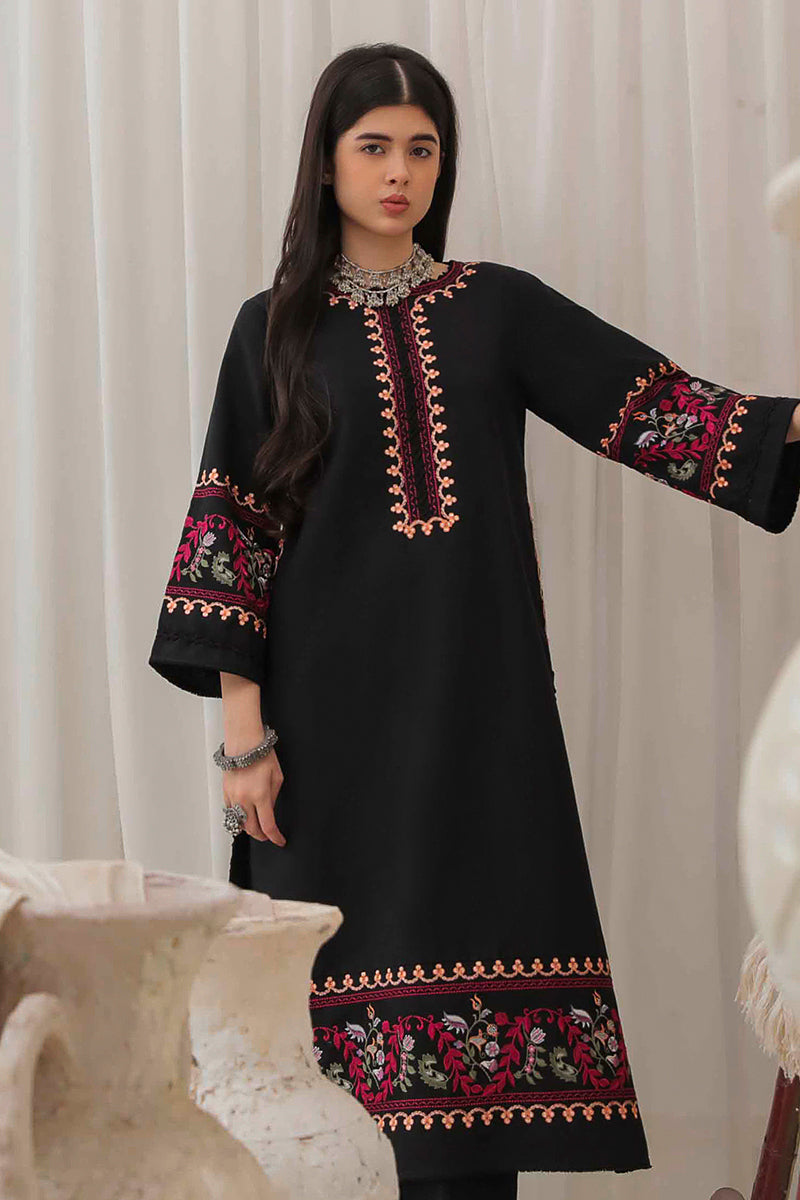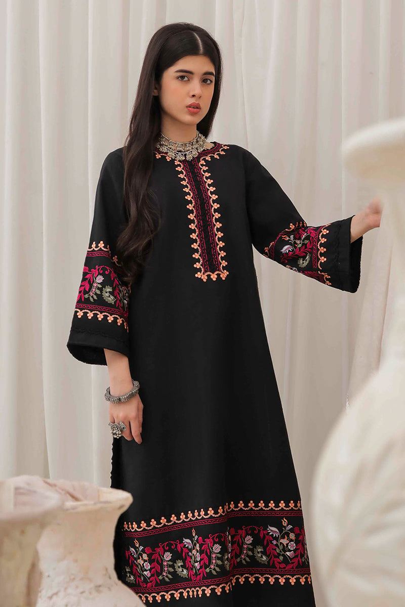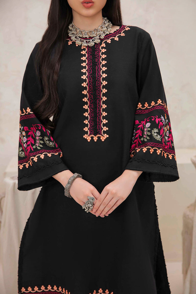 A bold black khaddar outfit, highlighted with delicate red embroidery, creates a striking contrast that exudes sophistication. Perfect for those who want to make a subtle yet powerful statement this winter!