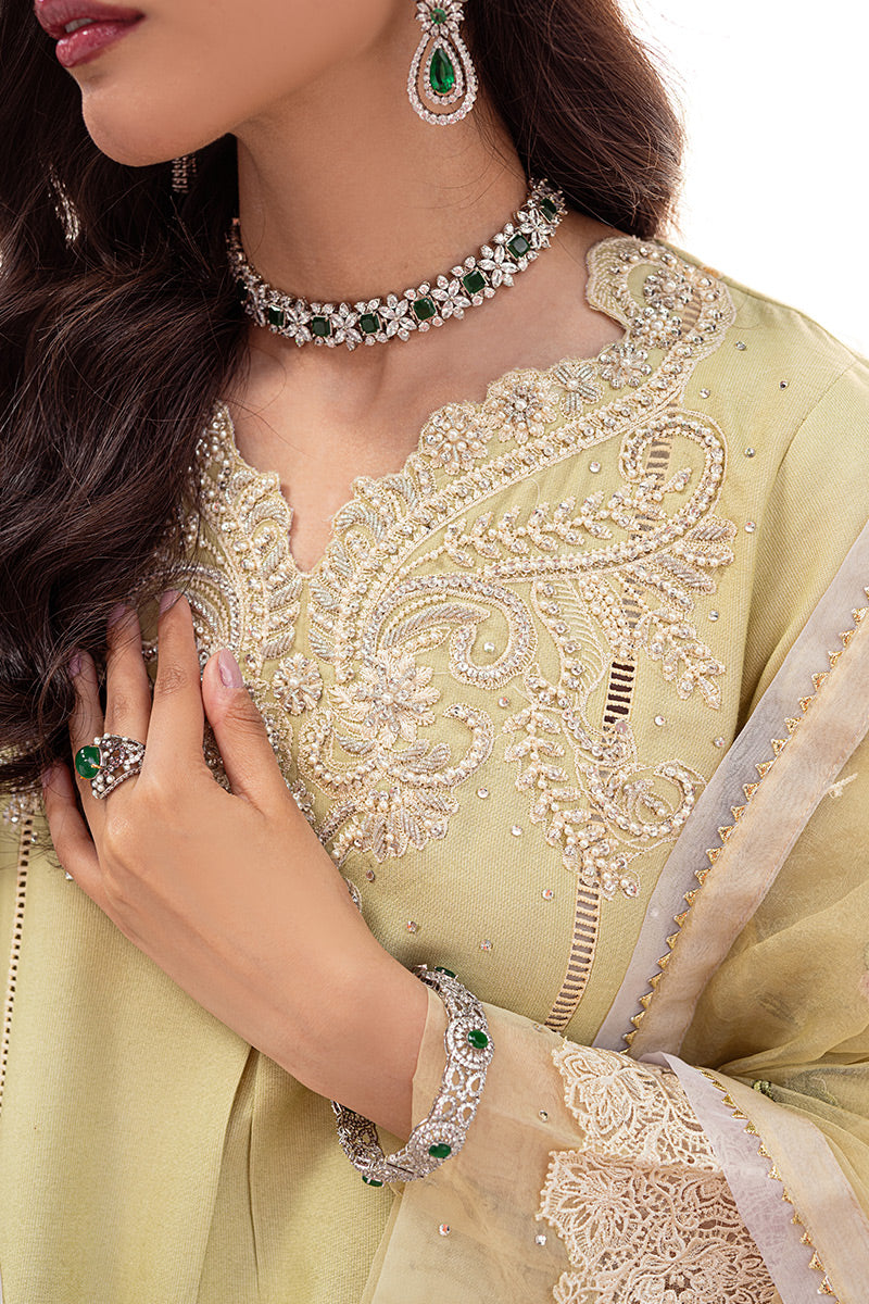Mellow green cotton net shirt elevated with a hand embellished neckline and embroidered borders comes with an all over embroidered organza dupata.