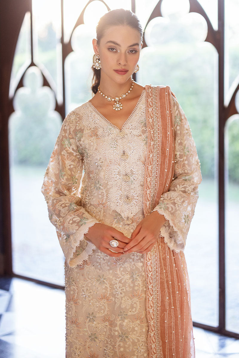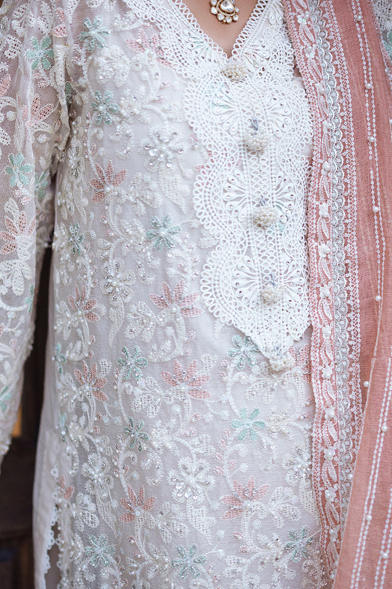 Elegant traditions meet contemporary chic in this stunning outfit. It is a masterpiece of understated luxury, featuring raw silk pants, a Chikankari embroidered shirt with light sequins, pearl and crystal embellishments, and a delicate milk lace neckline with pearl hanging tassels. This is a 3 pc outfit.